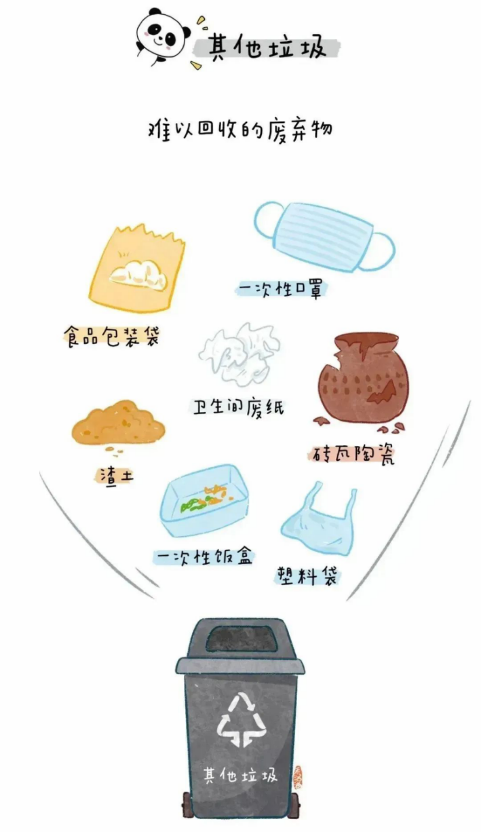 其他垃圾包括除上述几类垃圾之外的砖瓦陶瓷、渣土、卫生间废纸、纸巾等难以回收的废弃物及尘土、食品袋(盒)。采取卫生填埋可有效减少对地下水、地表水、土壤及空气的污染。